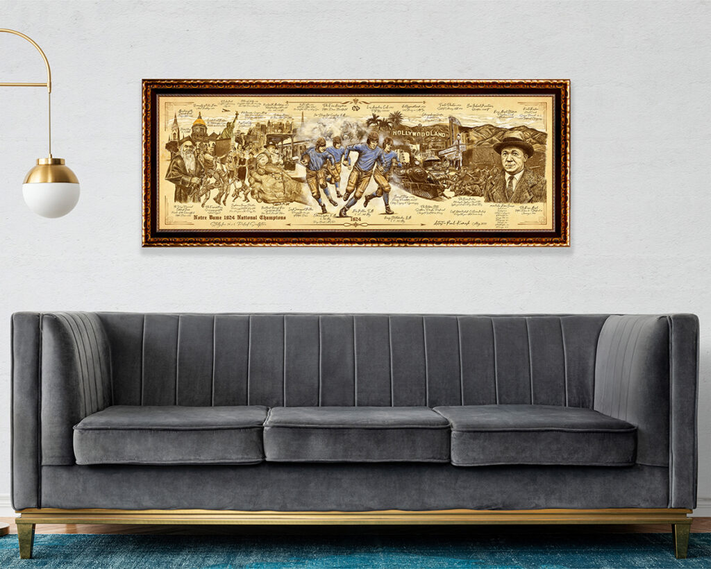In 2022, he collaborated with Jim Lefebvre and the Knute Rockne Memorial Society on a project commemorating the 1924 Notre Dame National Champions. A study print from this project now hangs beside Kamish’s Four Horsemen sculpture in the lobby of the Eck Visitors Center. The project moved through detailed study drawings and into Phase II with the creation of an 8-foot maquette that includes Knute Rockne.