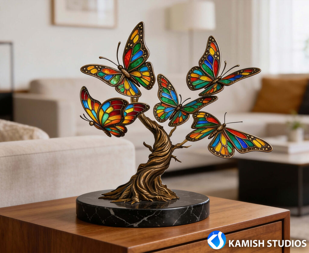 “Soaring Legacy” is an ascending composition of five butterflies—each marking a decade since the first women arrived at Notre Dame and embodying the themes of transformation, unity, progress, generational legacy, and enduring impact. They spiral upward in graceful motion, their wings filled with molten glass inlays of golden amber, deep red, and Notre Dame blue.